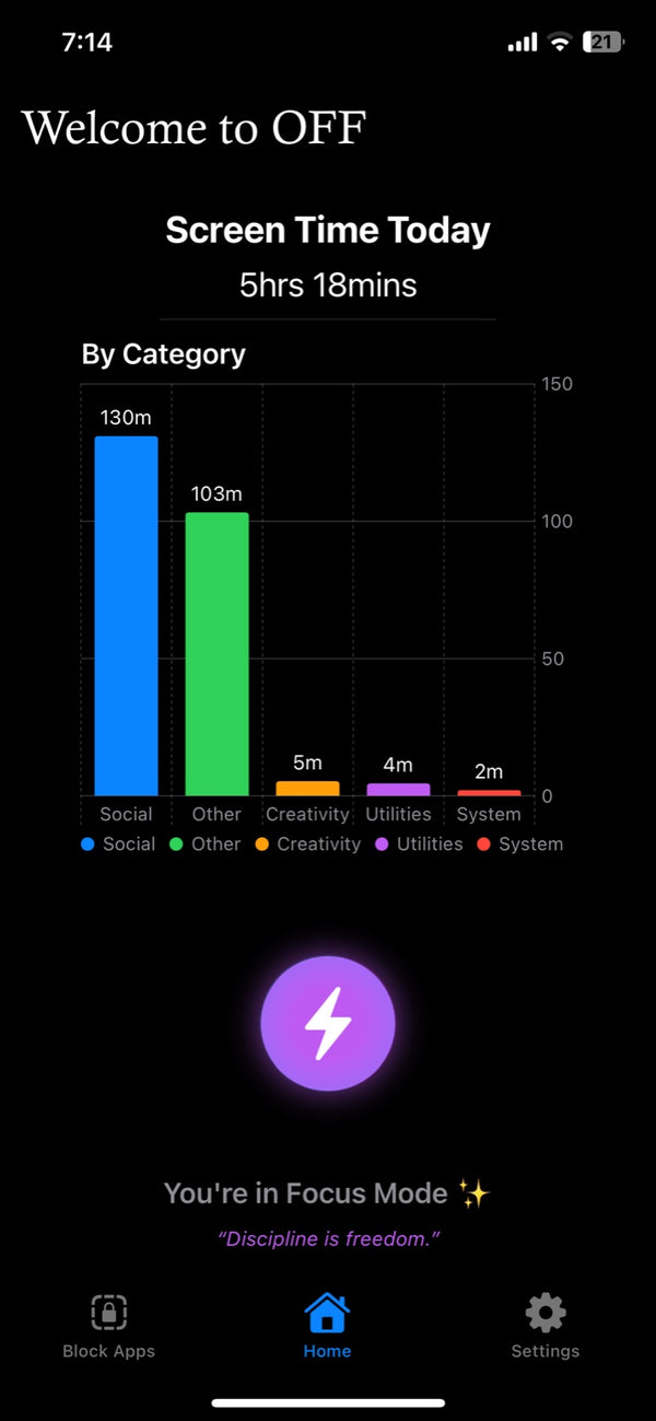 As soon as you're OFF, a timer starts - helping you track how long you stay focused.